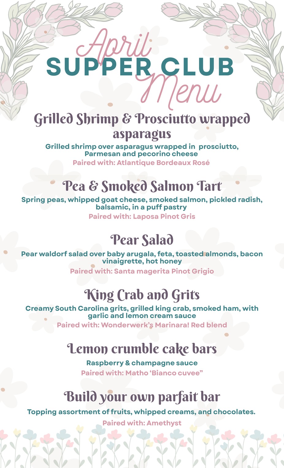 Our April Supper Club is right around the corner, and this is one you don’t want to miss. Think spring-inspired dishes, curated wine + cocktail pairings, and a cozy, intimate dinner experience at Isla’s.