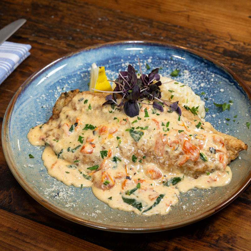 Fresh herb and panko breaded, baked, and served with horseradish mashed potatoes and sautéed green beans.