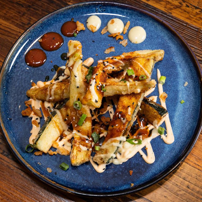 A medley of lightly battered and fried vegetables served tempura style with a side of sriracha aioli.