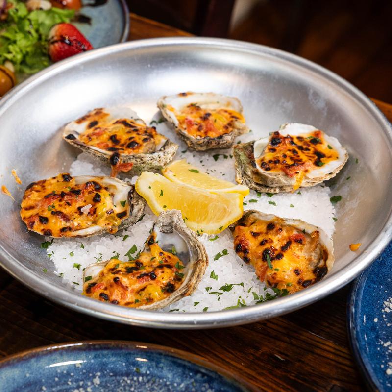 Half Dozen $20.00 | Dozen $38.00 • Broiled oysters topped with our house-made pimento cheese, smoked bacon, local honey, and banana peppers. Sweet, smoky, and just a little spicy — a bold Southern twist on classic oysters.
