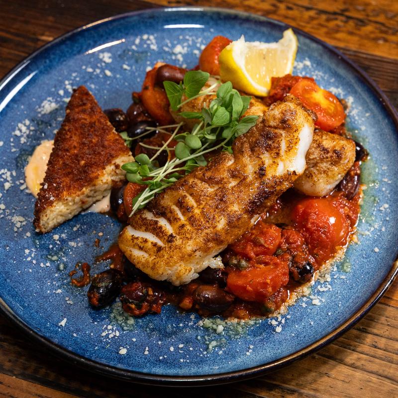 Served on a bed of sautéed cherry tomatoes, capers, Kalamata olives, fresh garlic, finished with fresh basil, and served with a grit cake.