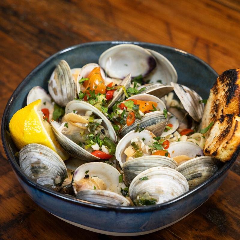 Fresh littleneck clams sautéed in olive oil, garlic, and white wine with grilled crostini, served regular or spicy.